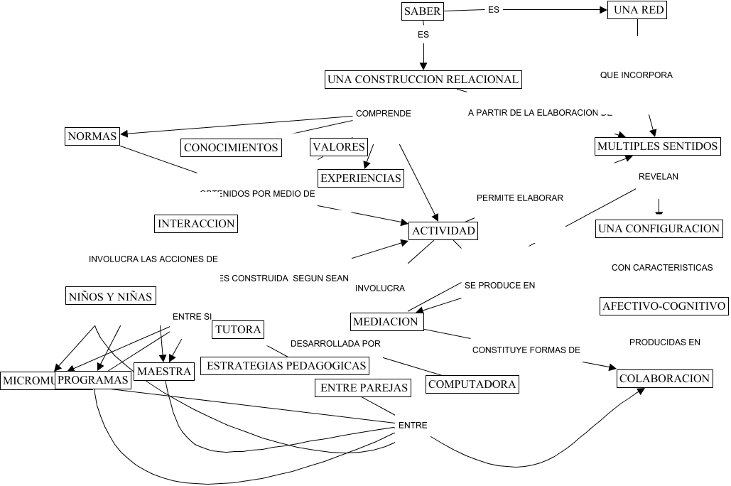 Esse mapa conceitual, produzido no IHMC CmapTools, tem a informação relacionada a: SABER, UNA CONFIGURACION CON CARACTERISTICAS AFECTIVO-COGNITIVO, INTERACCION ES CONSTRUIDA SEGUN SEAN MEDIACION, MICROMUNDOS ENTRE COLABORACION, ACTIVIDAD SE PRODUCE EN MEDIACION, EXPERIENCIAS OBTENIDOS POR MEDIO DE ACTIVIDAD, UNA CONSTRUCCION RELACIONAL COMPRENDE ACTIVIDAD, NORMAS OBTENIDOS POR MEDIO DE ACTIVIDAD, UNA CONSTRUCCION RELACIONAL A PARTIR DE LA ELABORACION DE MULTIPLES SENTIDOS, UNA RED QUE INCORPORA MULTIPLES SENTIDOS, NIÑOS Y NIÑAS ENTRE COLABORACION, CONOCIMIENTOS OBTENIDOS POR MEDIO DE ACTIVIDAD, NIÑOS Y NIÑAS INVOLUCRA LAS ACCIONES DE MICROMUNDOS, VALORES OBTENIDOS POR MEDIO DE ACTIVIDAD, NIÑOS Y NIÑAS INVOLUCRA LAS ACCIONES DE INTERACCION, TUTORA ENTRE SI MAESTRA, TUTORA ENTRE SI MICROMUNDOS, PROGRAMAS ENTRE COLABORACION, MAESTRA ENTRE COLABORACION, ACTIVIDAD PERMITE ELABORAR MULTIPLES SENTIDOS, NIÑOS Y NIÑAS INVOLUCRA LAS ACCIONES DE TUTORA