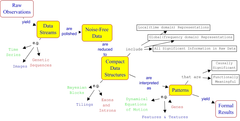 This Concept Map, created with IHMC CmapTools, has information related to: Data-relations, Patterns e.g. Genes, Patterns that are Functionally Meaningful, Compact Data Structures are interpreted as Patterns, Compact Data Structures include Local(time domain) Representations, Compact Data Structures include All Significant Information in Raw Data, Patterns e.g. Features & Textures, Compact Data Structures e.g. Tilings, Raw Observations yield Data Streams, Data Streams e.g. Time Series, Patterns yield Formal Results, Data Streams are polished Noise-Free Data, Compact Data Structures e.g. Bayesian Blocks, Patterns e.g. Dynamical Equations of Motion, Compact Data Structures include Global(frequency domain) Representations, Noise-Free Data are reduced to Compact Data Structures, Data Streams e.g. Genetic Sequences, Data Streams e.g. Images, Patterns that are Causally Significant, Compact Data Structures e.g. Exons and Introns
