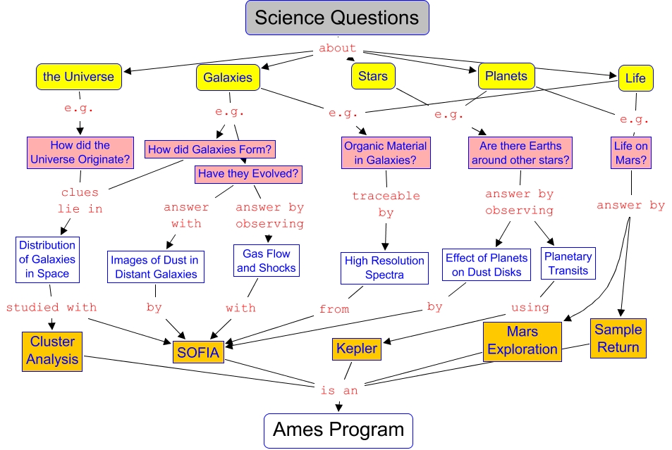 Esse mapa conceitual, produzido no IHMC CmapTools, tem a informação relacionada a: csi_science, Planets e.g. Life on Mars?, Kepler is an Ames Program, Are there Earths around other stars? answer by observing Planetary Transits, Galaxies e.g. Have they Evolved?, Galaxies e.g. How did Galaxies Form?, Sample Return is an Ames Program, Distribution of Galaxies in Space studied with SOFIA, Stars e.g. Are there Earths around other stars?, Organic Material in Galaxies? traceable by High Resolution Spectra, Science Questions about the Universe, Life on Mars? answer by Sample Return, How did Galaxies Form? clues lie in Distribution of Galaxies in Space, High Resolution Spectra from SOFIA, Planetary Transits using Kepler, Science Questions about Stars, Have they Evolved? answer by observing Gas Flow and Shocks, Images of Dust in Distant Galaxies by SOFIA, Gas Flow and Shocks with SOFIA, Life e.g. Life on Mars?, Are there Earths around other stars? answer by observing Effect of Planets on Dust Disks
