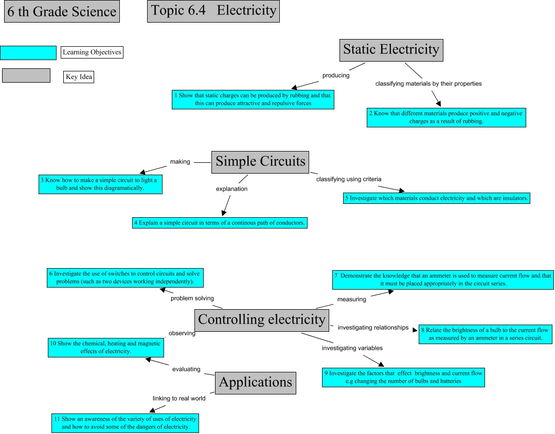 This Concept Map, created with IHMC CmapTools, has information related to: Electricity, Simple Circuits classifying using criteria 5 Investigate which materials conduct electricity and which are insulators., Static Electricity producing 1 Show that static charges can be produced by rubbing and that this can produce attractive and repulsive forces, Controlling electricity investigating variables 9 Investigate the factors that effect brightness and current flow e.g changing the number of bulbs and batteries, Applications linking to real world 11 Show an awareness of the variety of uses of electricity and how to avoid some of the dangers of electricity., Static Electricity classifying materials by their properties 2 Know that different materials produce positive and negative charges as a result of rubbing., Simple Circuits explanation 4 Explain a simple circuit in terms of a continous path of conductors., Applications evaluating 10 Show the chemical, heating and magnetic effects of electricity., Controlling electricity measuring 7 Demonstrate the knowledge that an ammeter is used to measure current flow and that it must be placed appropriately in the circuit series., Controlling electricity investigating relationships 8 Relate the brightness of a bulb to the current flow as measured by an ammeter in a series circuit., Controlling electricity problem solving 6 Investigate the use of switches to control circuits and solve problems (such as two devices working independently)., Controlling electricity observing 10 Show the chemical, heating and magnetic effects of electricity., Simple Circuits making 3 Know how to make a simple circuit to light a bulb and show this diagramatically.