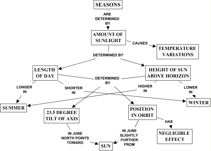 This Concept Map, created with IHMC CmapTools, has information related to: SEASONS, LENGTH OF DAY LONGER IN SUMMER, AMOUNT OF SUNLIGHT CAUSES TEMPERATURE VARIATIONS, 23.5 DEGREE TILT OF AXIS IN JUNE NORTH POINTS TOWARD SUN, LENGTH OF DAY DETERMINED BY 23.5 DEGREE TILT OF AXIS, POSITION IN ORBIT IN JUNE SLIGHTLY FURTHER FROM SUN, HEIGHT OF SUN ABOVE HORIZON LOWER IN WINTER, HEIGHT OF SUN ABOVE HORIZON HIGHER IN SUMMER, POSITION IN ORBIT HAS NEGLIGIBLE EFFECT, LENGTH OF DAY DETERMINED BY POSITION IN ORBIT, HEIGHT OF SUN ABOVE HORIZON DETERMINED BY POSITION IN ORBIT, HEIGHT OF SUN ABOVE HORIZON DETERMINED BY 23.5 DEGREE TILT OF AXIS, AMOUNT OF SUNLIGHT DETERMINED BY HEIGHT OF SUN ABOVE HORIZON, SEASONS ARE DETERMINED BY AMOUNT OF SUNLIGHT, LENGTH OF DAY SHORTER IN WINTER, AMOUNT OF SUNLIGHT DETERMINED BY LENGTH OF DAY