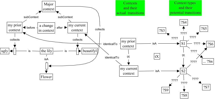 This Concept Map, created with IHMC CmapTools, has information related to: StateTransitions, my prior context isA S1, S1 ???? ?S6, S1 ???? ?S5, the lily isA Flower, S2 ???? ?S9, S1 ???? ?S4, my current context isA S2, my current context subContext Major context, a change in context before my prior context, my current context identicalTo my current context, S2 ???? ?S6, S1 ???? ... ?Sn, the lily is ugly, my prior context tX my current context, S1 tX S2, my prior context identicalTo my prior context, the lily is beautifyl, my prior context subContext Major context, my current context collects, a change in context after my current context