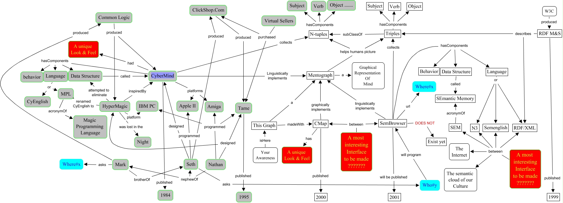 This Concept Map, created with IHMC CmapTools, has information related to: CyberMind vs CMap, Nathan programmed IBM PC, Triples hasComponents Verb, Language or N3, Nathan programmed Amiga, CyberMind hasComponents behavior, MPL acronymOf Magic Programming Language, CyberMind hasComponents Language, This Graph madeWith CMap, Mentograph helps humans picture N-tuples, SemBrowser hasComponents Behavior, CMap has A unique Look & Feel, A most interesting Interface to be made ??????? between RDF/XML, HyperMagic was lost in the Night, Triples subClassOf N-tuples, Seth designed CyberMind, CyberMind collects N-tuples, Who#y will program SemBrowser, CMap graphically implements Mentograph, RDF M&S describes RDF/XML, This Graph a Mentograph