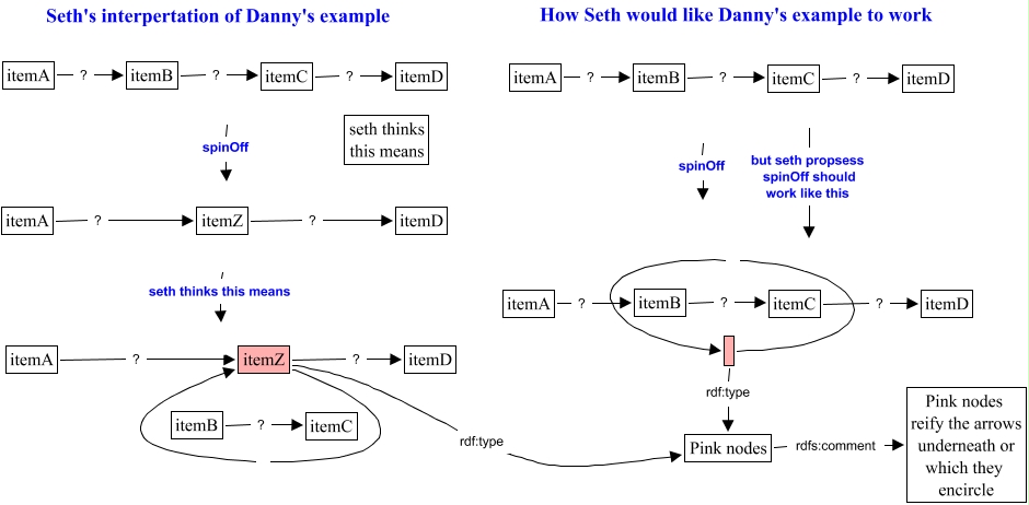 This Concept Map, created with IHMC CmapTools, has information related to: spinOff, itemZ ? itemD, itemA ? itemZ, itemC ? itemD, itemA ? itemB, itemB ? itemC, itemZ rdf:type Pink nodes, itemC ? itemD, itemC ? itemD, itemA ? itemZ, itemB ? itemC, itemB ? itemC, itemA ? itemB, spinOff, seth thinks this means, spinOff, itemB ? itemC, Pink nodes rdfs:comment Pink nodes reify the arrows underneath or which they encircle, itemA ? itemB, but seth propsess spinOff should work like this, itemZ ? itemD