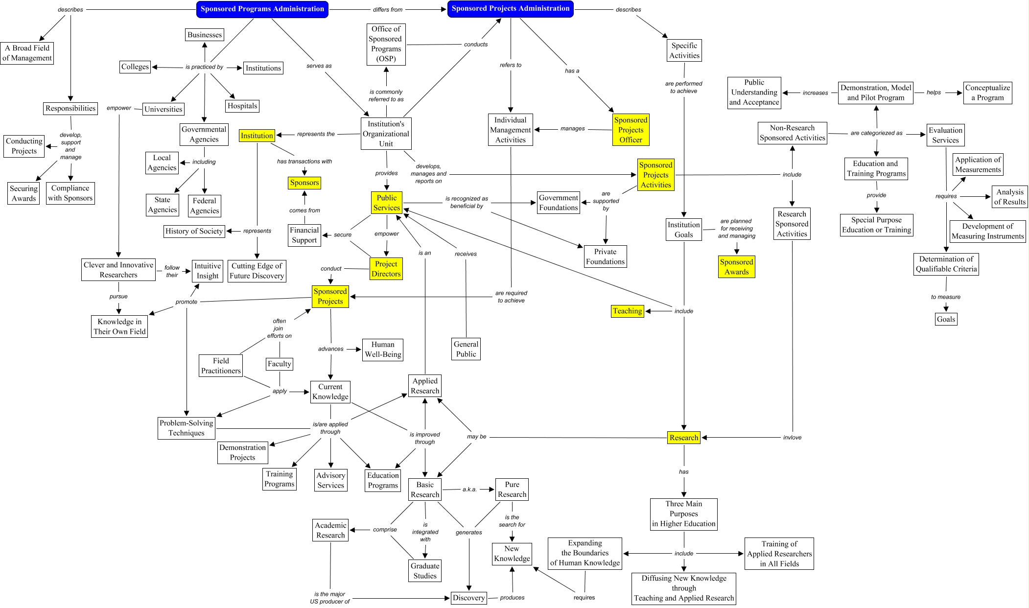 Dieses mit IHMC CmapTools erstellte CMap hat Informationen bezüglich: 01 - Development and Scope, Governmental Agencies including State Agencies, Pure Research generates Discovery, Non-Research Sponsored Activities are categoriezed as Evaluation Services, Institution Goals include Public Services, Sponsored Projects Activities are supported by Government Foundations, Expanding the Boundaries of Human Knowledge requires New Knowledge, Public Services empower Project Directors, Basic Research generates Discovery, Graduate Studies comprise Academic Research, Basic Research comprise Academic Research, Three Main Purposes in Higher Education include Expanding the Boundaries of Human Knowledge, Non-Research Sponsored Activities are categoriezed as Education and Training Programs, Problem-Solving Techniques is/are applied through Advisory Services, Education and Training Programs provide Special Purpose Education or Training, Academic Research is the major US producer of Discovery, Office of Sponsored Programs (OSP) conducts Sponsored Projects Administration, Current Knowledge is improved through Basic Research, Project Directors conduct Sponsored Projects, Project Directors secure Financial Support, Problem-Solving Techniques is/are applied through Demonstration Projects