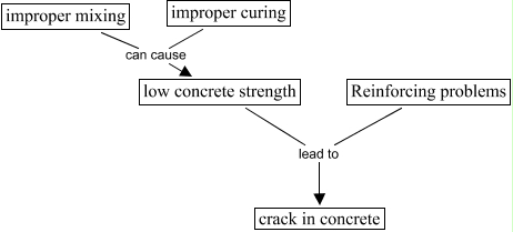 This Concept Map, created with IHMC CmapTools, has information related to: manifestation, Reinforcing problems lead to crack in concrete, low concrete strength lead to crack in concrete, improper curing can cause low concrete strength, improper mixing can cause low concrete strength