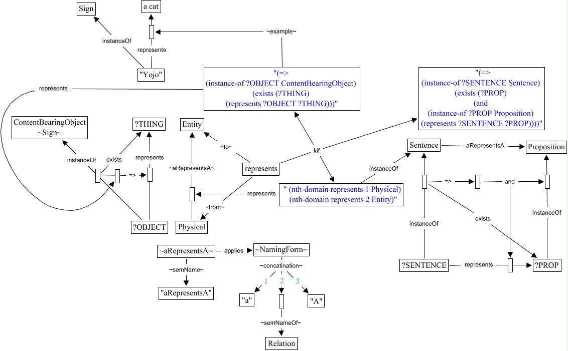 This Concept Map, created with IHMC CmapTools, has information related to: represents1, Physical ~aRepresentsA~ Entity, ~NamingForm~ ~concatination~ "A", ?PROP instanceOf Proposition, exists ?THING, ~semNameOf~ Relation, ?OBJECT represents ?THING, " (nth-domain represents 1 Physical) (nth-domain represents 2 Entity)" instanceOf Sentence, ?SENTENCE instanceOf Sentence, and, "(=> (instance-of ?OBJECT ContentBearingObject) (exists (?THING) (represents ?OBJECT ?THING)))" ~example~, represents ~to~ Entity, ~aRepresentsA~ applies ~NamingForm~, represents kif " (nth-domain represents 1 Physical) (nth-domain represents 2 Entity)", represents ~from~ Physical, ~aRepresentsA~ ~semName~ "aRepresentsA", =>, =>, ~NamingForm~ ~concatination~, exists ?PROP, ~NamingForm~ ~concatination~ "a"