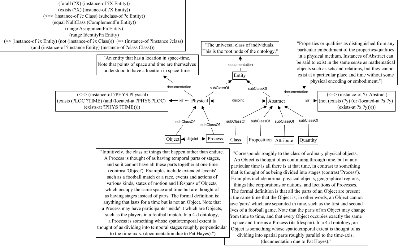 This Concept Map, created with IHMC CmapTools, has information related to: Entity, Physical kif (<=> (instance-of ?PHYS Physical) (exists (?LOC ?TIME) (and (located-at ?PHYS ?LOC) (exists-at ?PHYS ?TIME)))), Object subClassOf Physical, Object disjoint Process, Proposition subClassOf Abstract, Abstract kif (<=> (instance-of ?x Abstract) (not (exists (?y) (or (located-at ?x ?y) (exists-at ?x ?y))))), Abstract disjoint Physical, Physical subClassOf Entity, Entity documentation "The universal class of individuals. This is the root node of the ontology.", Process subClassOf Physical, Attribute subClassOf Abstract, Abstract subClassOf Entity, Abstract documentation "Properties or qualities as distinguished from any particular embodiment of the properties/qualities in a physical medium. Instances of Abstract can be said to exist in the same sense as mathematical objects such as sets and relations, but they cannot exist at a particular place and time without some physical encoding or embodiment."), Physical disjoint Abstract, Process disjoint Object, Class subClassOf Abstract, Physical documentation "An entity that has a location in space-time. Note that points of space and time are themselves understood to have a location in space-time", Quantity subClassOf Abstract