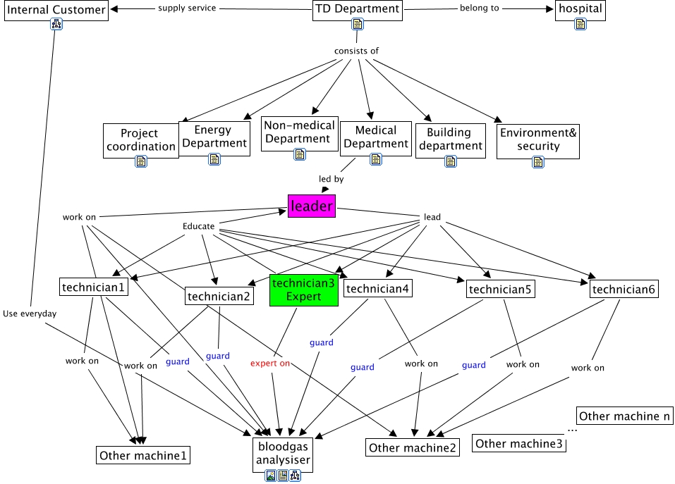 This Concept Map, created with IHMC CmapTools, has information related to: TDmap3, technician3 Expert Educate technician2, leader lead technician3 Expert, technician6 work on Other machine2, TD Department consists of Energy Department, technician3 Expert Educate technician1, TD Department consists of Environment& security, leader lead technician4, technician4 work on Other machine2, technician2 guard bloodgas analysiser, technician6 guard bloodgas analysiser, leader work on Other machine1, technician1 guard bloodgas analysiser, leader lead technician2, technician3 Expert expert on bloodgas analysiser, technician3 Expert Educate leader, technician3 Expert Educate technician4, TD Department consists of Building department, TD Department belong to hospital, TD Department supply service Internal Customer, Medical Department led by leader