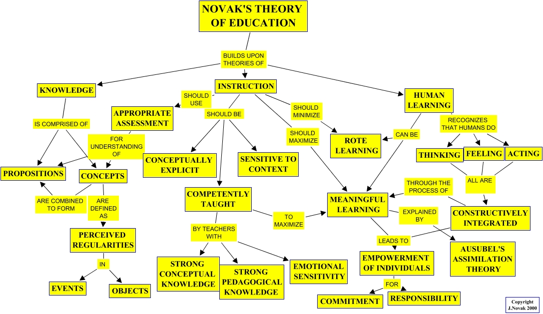 This Concept Map, created with IHMC CmapTools, has information related to: NOVAK'S THEORY OF ED, INSTRUCTION SHOULD BE COMPETENTLY TAUGHT, CONSTRUCTIVELY INTEGRATED LEADS TO EMPOWERMENT OF INDIVIDUALS, EMPOWERMENT OF INDIVIDUALS FOR COMMITMENT, NOVAK'S THEORY OF EDUCATION BUILDS UPON THEORIES OF HUMAN LEARNING, COMPETENTLY TAUGHT BY TEACHERS WITH STRONG PEDAGOGICAL KNOWLEDGE, EMPOWERMENT OF INDIVIDUALS FOR RESPONSIBILITY, INSTRUCTION SHOULD USE APPROPRIATE ASSESSMENT, CONCEPTS ARE DEFINED AS PERCEIVED REGULARITIES, KNOWLEDGE IS COMPRISED OF PROPOSITIONS, ACTING ALL ARE CONSTRUCTIVELY INTEGRATED, INSTRUCTION SHOULD BE CONCEPTUALLY EXPLICIT, HUMAN LEARNING RECOGNIZES THAT HUMANS DO THINKING, COMPETENTLY TAUGHT BY TEACHERS WITH EMOTIONAL SENSITIVITY, PERCEIVED REGULARITIES IN EVENTS, MEANINGFUL LEARNING LEADS TO EMPOWERMENT OF INDIVIDUALS, PERCEIVED REGULARITIES IN OBJECTS, CONCEPTS ARE COMBINED TO FORM PROPOSITIONS, APPROPRIATE ASSESSMENT FOR UNDERSTANDING OF PROPOSITIONS, APPROPRIATE ASSESSMENT FOR UNDERSTANDING OF CONCEPTS, INSTRUCTION SHOULD MINIMIZE ROTE LEARNING