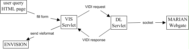 This Concept Map, created with IHMC CmapTools, has information related to: flow, DL Servlet VIDI response VIS Servlet, VIS Servlet send visformat ENVISION, user query HTML page fill form VIS Servlet, VIS Servlet VIDI request DL Servlet, DL Servlet socket MARIAN Webgate