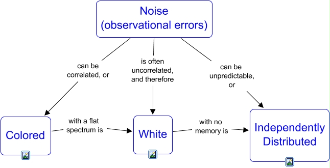 This Concept Map, created with IHMC CmapTools, has information related to: Noise, Noise (observational errors) is often uncorrelated, and therefore White, Colored with a flat spectrum is White, Noise (observational errors) can be unpredictable, or Independently Distributed, White with no memory is Independently Distributed, Noise (observational errors) can be correlated, or Colored
