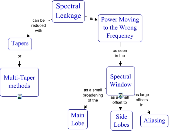 This Concept Map, created with IHMC CmapTools, has information related to: Leakage, Power Moving to the Wrong Frequency as seen in the Spectral Window, Spectral Leakage is Power Moving to the Wrong Frequency, Tapers or Multi-Taper methods, Spectral Leakage can be reduced with Tapers, Spectral Window as a small broadening of the Main Lobe, Spectral Window as large offsets in Aliasing, Spectral Window as a small offset to Side Lobes