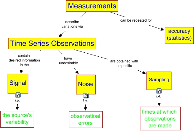 This Concept Map, created with IHMC CmapTools, has information related to: Time Series, Time Series Observations are obtained with a specific Sampling, Noise i.e. observatioal errors, Time Series Observations have undesirable Noise, Measurements describe variations via Time Series Observations, Measurements can be repeated for accuracy (statistics), Time Series Observations contain desired information in the Signal, Sampling i.e. times at which observations are made, Signal i.e. the source's variability