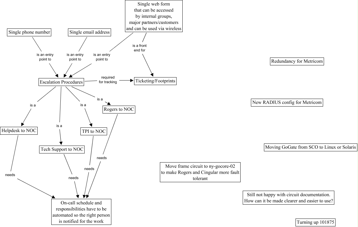 This Concept Map, created with IHMC CmapTools, has information related to: Terrence's-Brain, Tech Support to NOC needs On-call schedule and responsibilities have to be automated so the right person is notified for the work, Single phone number is an entry point to Escalation Procedures, Escalation Procedures is a Tech Support to NOC, Single web form that can be accessed by internal groups, major partners/customers and can be used via wireless is a front end for Ticketing/Footprints, Single email address is an entry point to Escalation Procedures, Single web form that can be accessed by internal groups, major partners/customers and can be used via wireless is an entry point to Escalation Procedures, Escalation Procedures is a Helpdesk to NOC, Rogers to NOC needs On-call schedule and responsibilities have to be automated so the right person is notified for the work, Escalation Procedures is a Rogers to NOC, Escalation Procedures required for tracking Ticketing/Footprints, TPI to NOC needs On-call schedule and responsibilities have to be automated so the right person is notified for the work, Escalation Procedures is a TPI to NOC, Helpdesk to NOC needs On-call schedule and responsibilities have to be automated so the right person is notified for the work