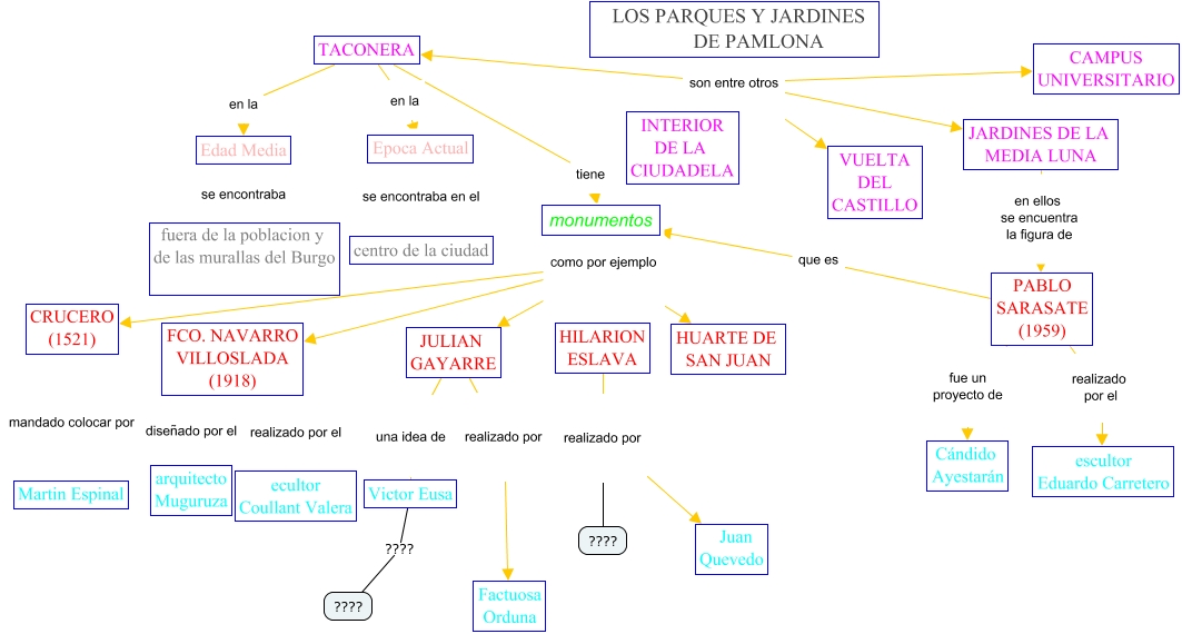 Este Cmap, tiene información relacionada con: PARQUES Y JARDINES DE PAMPLONA, TACONERA en la Epoca Actual, monumentos como por ejemplo CRUCERO (1521), PABLO SARASATE (1959) realizado por el escultor Eduardo Carretero, PABLO SARASATE (1959) que es monumentos, TACONERA tiene monumentos, LOS PARQUES Y JARDINES DE PAMLONA son entre otros JARDINES DE LA MEDIA LUNA, Edad Media se encontraba fuera de la poblacion y de las murallas del Burgo, LOS PARQUES Y JARDINES DE PAMLONA son entre otros CAMPUS UNIVERSITARIO, LOS PARQUES Y JARDINES DE PAMLONA son entre otros INTERIOR DE LA CIUDADELA, monumentos como por ejemplo JULIAN GAYARRE, JARDINES DE LA MEDIA LUNA en ellos se encuentra la figura de PABLO SARASATE (1959), HILARION ESLAVA realizado por Juan Quevedo, Victor Eusa ???? ????, Epoca Actual se encontraba en el centro de la ciudad, PABLO SARASATE (1959) fue un proyecto de Cándido Ayestarán, HILARION ESLAVA realizado por ????, CRUCERO (1521) mandado colocar por Martin Espinal, JULIAN GAYARRE realizado por Factuosa Orduna, TACONERA en la Edad Media, JULIAN GAYARRE una idea de Victor Eusa