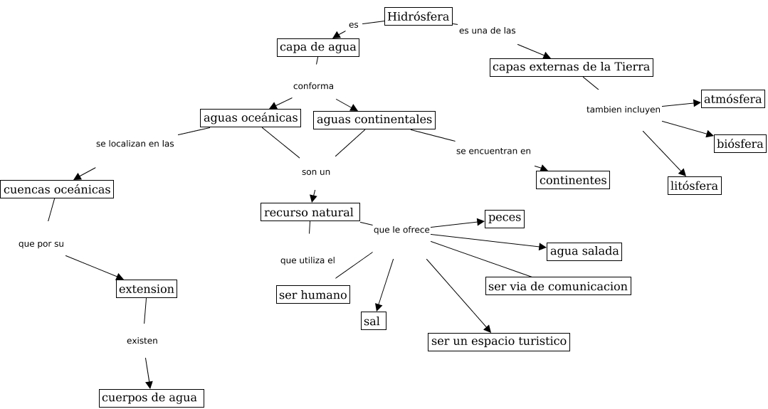 Este Cmap, tiene información relacionada con: HIDROSFERA, extension existen cuerpos de agua, ser via de comunicacion que le ofrece agua salada, recurso natural que le ofrece ser un espacio turistico, cuencas oceánicas que por su extension, Hidrósfera es una de las capas externas de la Tierra, ser via de comunicacion que le ofrece peces, recurso natural que le ofrece agua salada, aguas oceánicas se localizan en las cuencas oceánicas, recurso natural que le ofrece sal, Hidrósfera es capa de agua, ser via de comunicacion que le ofrece sal, recurso natural que le ofrece ser humano, capa de agua conforma aguas continentales, aguas continentales son un recurso natural, ser via de comunicacion que le ofrece ser humano, capas externas de la Tierra tambien incluyen biósfera, ser via de comunicacion que le ofrece ser un espacio turistico, recurso natural que utiliza el ser humano, recurso natural que le ofrece peces, capa de agua conforma aguas oceánicas