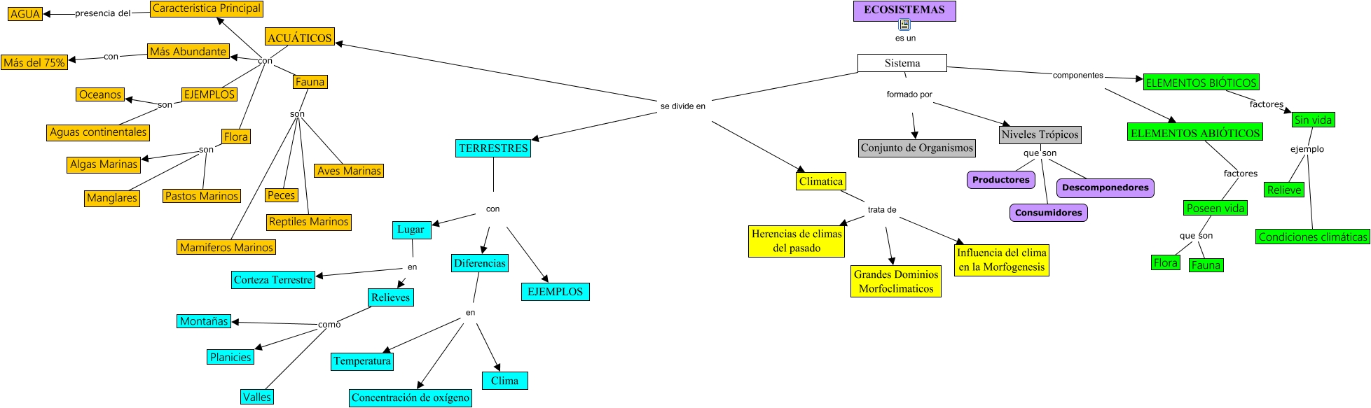 Este Cmap, tiene información relacionada con: Geomorfologia, Poseen vida que son Fauna, Flora son Algas Marinas, ACUÁTICOS con Fauna, ACUÁTICOS con EJEMPLOS, ACUÁTICOS con Caracteristica Principal, Fauna son Reptiles Marinos, Sistema se divide en ACUÁTICOS, ACUÁTICOS con Flora, Caracteristica Principal presencia del AGUA, Poseen vida que son Flora, Climatica trata de Herencias de climas del pasado, EJEMPLOS son Oceanos, TERRESTRES con Lugar, Sistema componentes ELEMENTOS ABIÓTICOS, Fauna son Peces, Sistema se divide en Climatica, Sistema componentes ELEMENTOS BIÓTICOS, Diferencias en Temperatura, Niveles Trópicos que son Productores, Flora son Manglares
