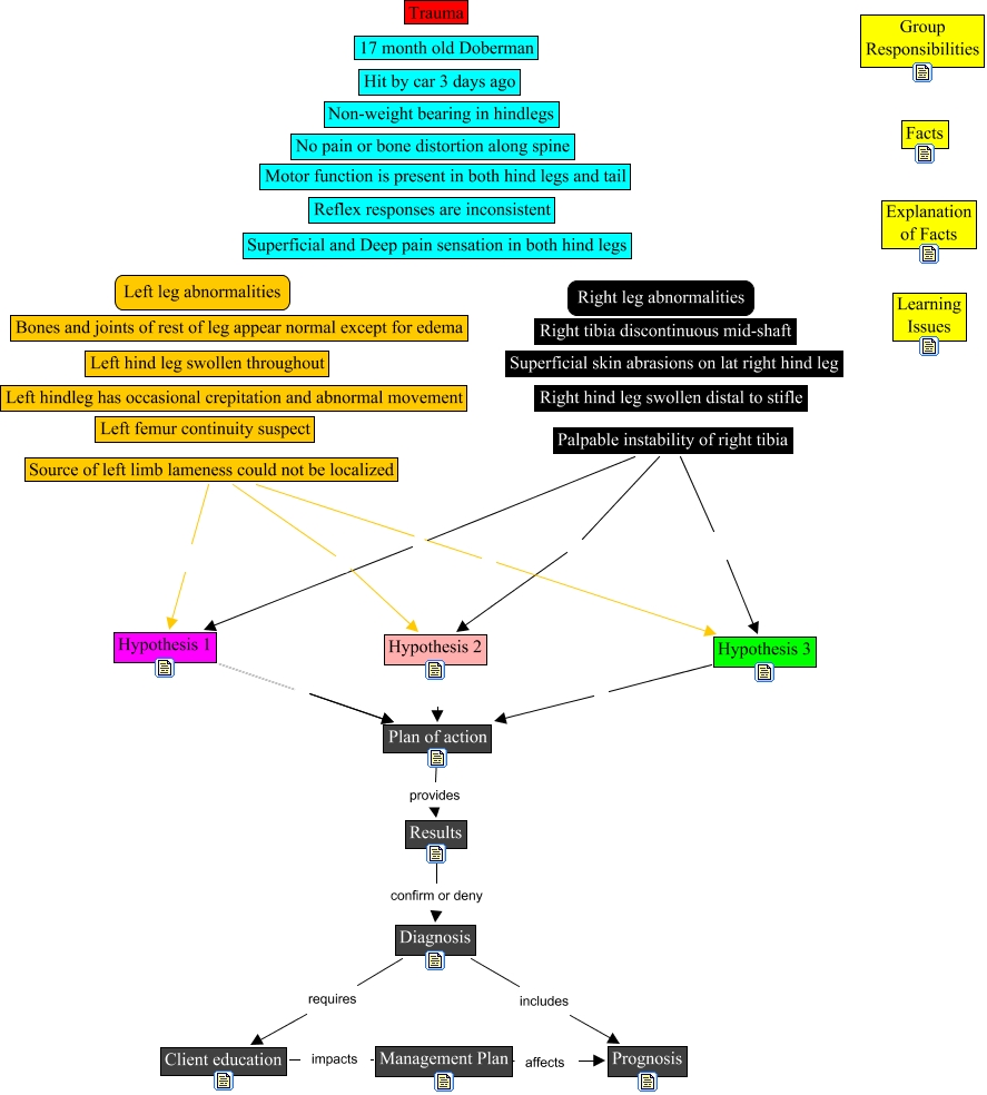 This Concept Map, created with IHMC CmapTools, has information related to: Case04_Group01, Palpable instability of right tibia Hypothesis 3, Management Plan affects Prognosis, Hypothesis 2 Plan of action, Diagnosis includes Prognosis, Palpable instability of right tibia Hypothesis 1, Plan of action provides Results, Source of left limb lameness could not be localized Hypothesis 2, Hypothesis 3 Plan of action, Results confirm or deny Diagnosis, Palpable instability of right tibia Hypothesis 2, Client education impacts Management Plan, Hypothesis 1 Plan of action, Diagnosis requires Client education, Source of left limb lameness could not be localized Hypothesis 3, Hypothesis 1 Plan of action, Source of left limb lameness could not be localized Hypothesis 1