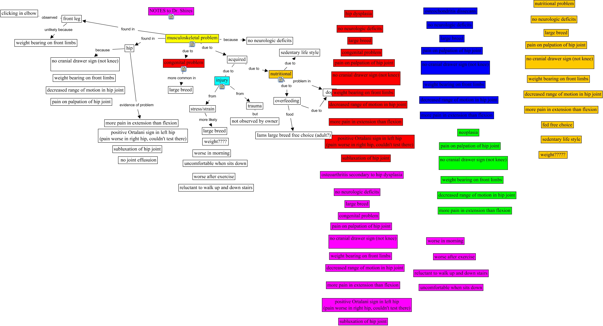 This Concept Map, created with IHMC CmapTools, has information related to: Case01_Group03, stress/strain more likely large breed, hip evidence of problem more pain in extension than flexion, trauma but not observed by owner, nutritional problem in dogs, overfeeding due to dogs, injury from stress/strain, acquired due to injury, acquired due to nutritional, musculoskeletal problem due to acquired, front leg unlikely because weight bearing on front limbs, nutritional due to overfeeding, nutritional due to sedentary life style, congenital problem more common in large breed, front leg observed clicking in elbow, musculoskeletal problem because no neurologic deficits, hip because no cranial drawer sign (not knee), musculoskeletal problem found in front leg, overfeeding food Iams large breed free choice (adult?), musculoskeletal problem found in hip, musculoskeletal problem due to congenital problem