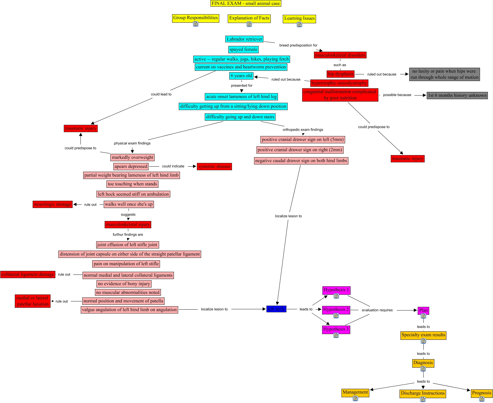 This Concept Map, created with IHMC CmapTools, has information related to: Final01_Group03, apears depressed could indicate systemic disease, walks well once she's up suggests musculoskeletal injury, congenital malformation complicated by poor nutrition could predispose to traumatic injury, 6 years old presented for acute onset lameness of left hind leg, left stifle leads to Hypothesis 1, Plan leads to Specialty exam results, Diagnosis leads to Prognosis, Hypothesis 3 evaluation requires Plan, markedly overweight could predispose to traumatic injury, normal medial and lateral collateral ligaments rule out collateral ligament damage, Specialty exam results leads to Diagnosis, hip dysplasia ruled out because no laxity or pain when hips were run through whole range of motion, Hypothesis 2 evaluation requires Plan, walks well once she's up rule out neurologic damage, Hypothesis 1 evaluation requires Plan, musculoskeletal injury furthur findings are joint effusion of left stifle joint, Labrador retriever breed predisposition for musculoskeletal disorders, musculoskeletal disorders such as hip dysplasia, negative caudal drawer sign on both hind limbs localize lesion to left stifle, Diagnosis leads to Discharge Instructions