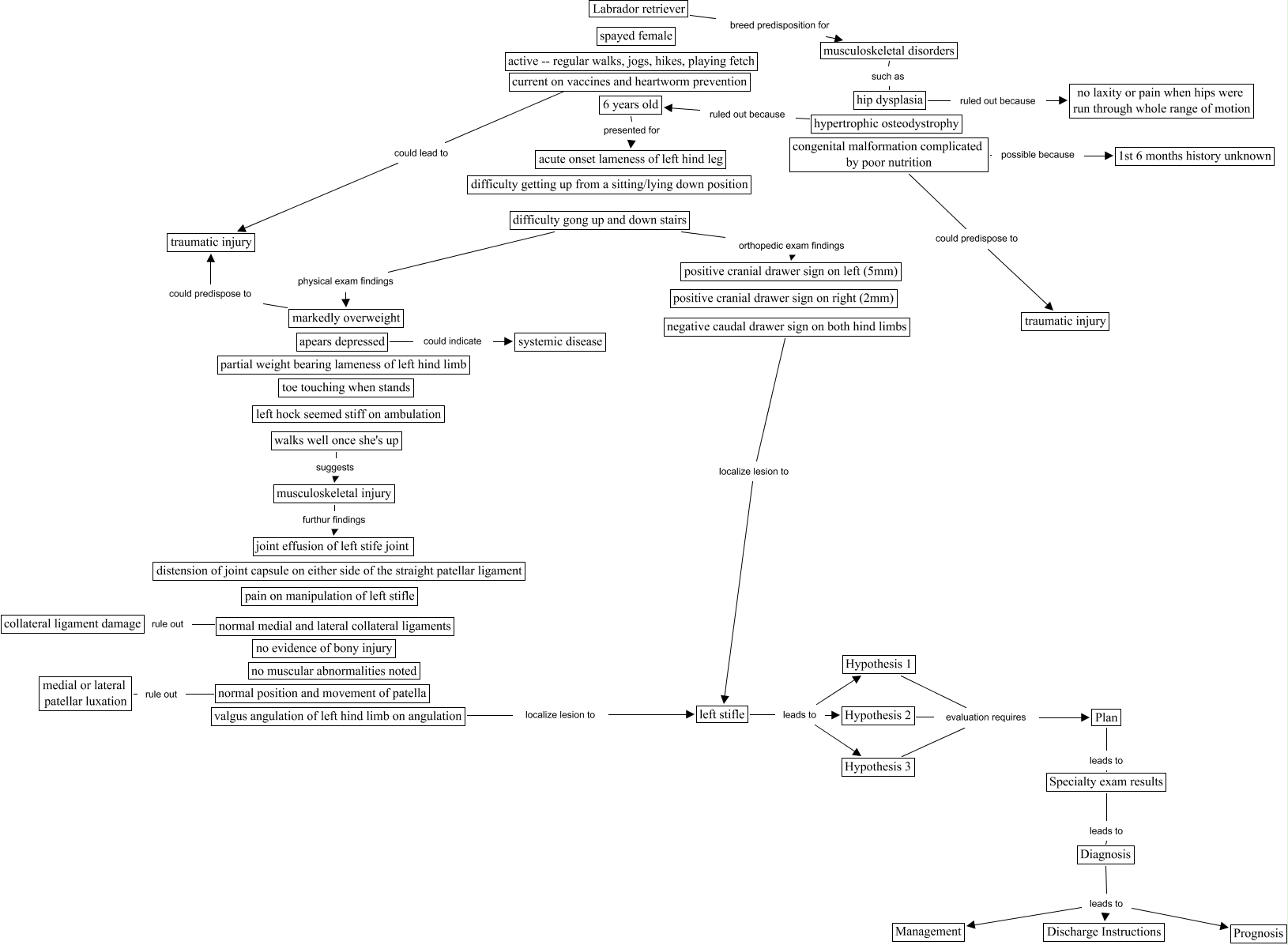 This Concept Map, created with IHMC CmapTools, has information related to: Final01_Group03 backup 1, valgus angulation of left hind limb on angulation localize lesion to left stifle, hypertrophic osteodystrophy ruled out because 6 years old, Diagnosis leads to Discharge Instructions, walks well once she's up suggests musculoskeletal injury, normal medial and lateral collateral ligaments rule out collateral ligament damage, hip dysplasia ruled out because no laxity or pain when hips were run through whole range of motion, difficulty gong up and down stairs orthopedic exam findings positive cranial drawer sign on left (5mm), markedly overweight could predispose to traumatic injury, normal position and movement of patella rule out medial or lateral patellar luxation, left stifle leads to Hypothesis 3, Diagnosis leads to Management, Plan leads to Specialty exam results, Labrador retriever breed predisposition for musculoskeletal disorders, congenital malformation complicated by poor nutrition could predispose to traumatic injury, difficulty gong up and down stairs physical exam findings markedly overweight, musculoskeletal disorders such as hip dysplasia, congenital malformation complicated by poor nutrition possible because 1st 6 months history unknown, musculoskeletal injury furthur findings joint effusion of left stife joint, Hypothesis 1 evaluation requires Plan, left stifle leads to Hypothesis 2