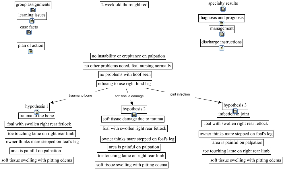 Este Cmap, tiene información relacionada con: Case03_Group14, refusing to use right hind leg trauma to bone hypothesis 1, refusing to use right hind leg joint infection hypothesis 3, refusing to use right hind leg soft tissue damage hypothesis 2