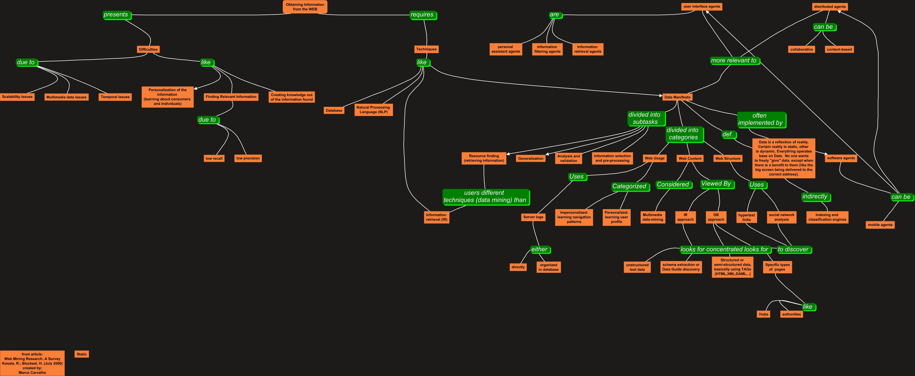 Bu Kavram Haritasının içerdiği bilgi: Data Manifesto, Techniques like Information retrieval (IR), Web Usage Uses Server logs, distributed agents more relevant to Data Manifesto, Difficulties like Finding Relevant Information, Specific types of pages like Hubs, Data Manifesto divided into subtasks Analysis and validation, Data Manifesto divided into subtasks Generalization, user interface agents more relevant to Data Manifesto, hypertext links to discover Specific types of pages, DB approach looks for Structured or semi-structured data, basically using TAGs (HTML,XML,DAML...), Specific types of pages like authorities, Difficulties due to Multimedia data issues, IR approach looks for unstructured text data, Techniques like Natural Processing Language (NLP), Finding Relevant Information due to low recall, Resource finding (retrieving information) users different techniques (data mining) than Information retrieval (IR), Data Manifesto divided into categories Web Content, Data Manifesto divided into subtasks Resource finding (retrieving information), Data Manifesto often implemented by software agents, software agents can be distributed agents