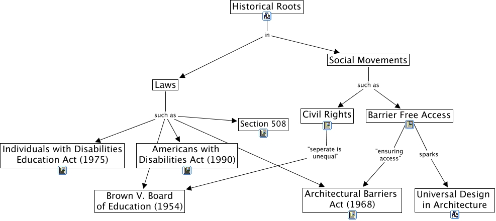 This Concept Map, created with IHMC CmapTools, has information related to: UDE Historical Roots, Civil Rights "seperate is unequal" Brown V. Board of Education (1954), Historical Roots in Social Movements, Social Movements such as Civil Rights, Social Movements such as Barrier Free Access, Laws such as Architectural Barriers Act (1968), Historical Roots in Laws, Laws such as Individuals with Disabilities Education Act (1975), Laws such as Section 508, Laws such as Brown V. Board of Education (1954), Barrier Free Access "ensuring access" Architectural Barriers Act (1968), Barrier Free Access sparks Universal Design in Architecture, Laws such as Americans with Disabilities Act (1990)