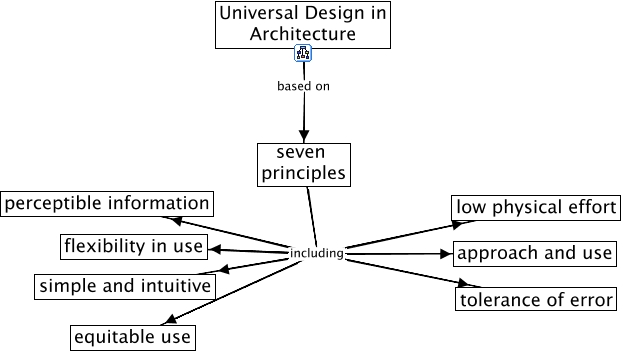 This Concept Map, created with IHMC CmapTools, has information related to: UDE in Architecture, seven principles including equitable use, Universal Design in Architecture based on seven principles, seven principles including flexibility in use, seven principles including perceptible information, seven principles including tolerance of error, seven principles including low physical effort, seven principles including approach and use, seven principles including simple and intuitive