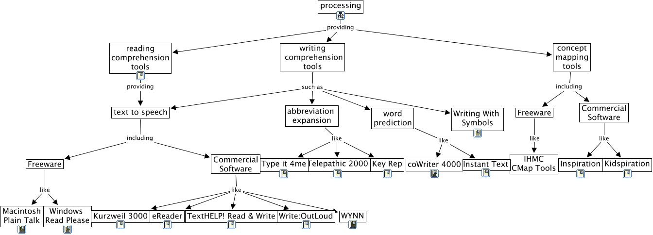 This Concept Map, created with IHMC CmapTools, has information related to: Processing AT Concept Map, writing comprehension tools such as Writing With Symbols, Freeware like IHMC CMap Tools, Commercial Software like Kurzweil 3000, Freeware like Windows Read Please, Commercial Software like WYNN, word prediction like coWriter 4000, concept mapping tools including Freeware, writing comprehension tools such as word prediction, Commercial Software like Write:OutLoud, Commercial Software like eReader, reading comprehension tools providing text to speech, abbreviation expansion like Key Rep, processing providing writing comprehension tools, processing providing concept mapping tools, text to speech including Freeware, abbreviation expansion like Type it 4me, text to speech including Commercial Software, Commercial Software like TextHELP! Read & Write, abbreviation expansion like Telepathic 2000, concept mapping tools including Commercial Software