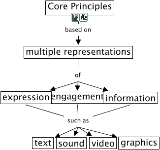This Concept Map, created with IHMC CmapTools, has information related to: UDE Core Principles, engagement such as graphics, multiple representations of engagement, Core Principles based on multiple representations, information such as text, engagement such as text, information such as video, expression such as video, multiple representations of information, expression such as sound, expression such as text, multiple representations of expression, engagement such as video, information such as graphics, engagement such as sound, expression such as graphics, information such as sound