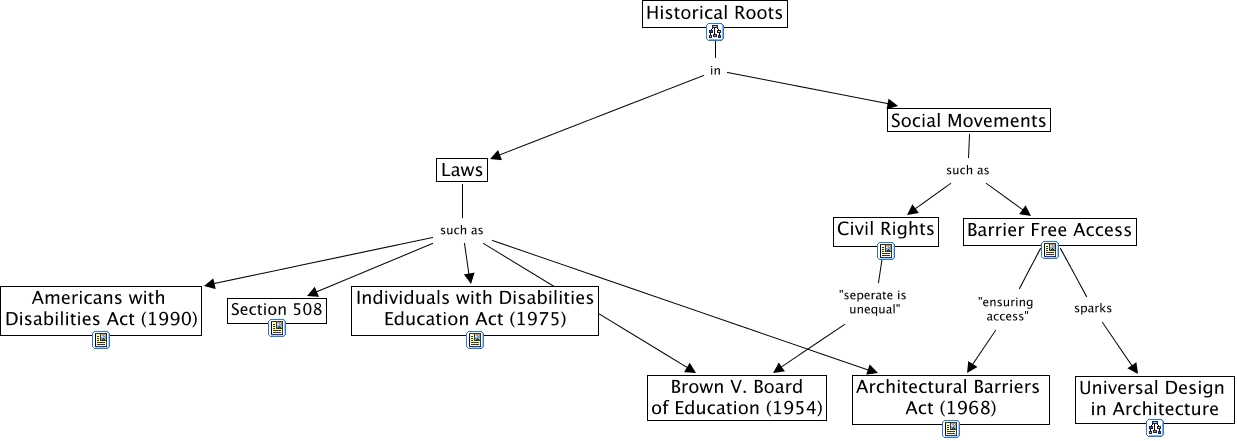 This Concept Map, created with IHMC CmapTools, has information related to: UDE Historical Roots, Laws such as Americans with Disabilities Act (1990), Social Movements such as Barrier Free Access, Civil Rights "seperate is unequal" Brown V. Board of Education (1954), Laws such as Section 508, Barrier Free Access "ensuring access" Architectural Barriers Act (1968), Barrier Free Access sparks Universal Design in Architecture, Laws such as Brown V. Board of Education (1954), Historical Roots in Social Movements, Laws such as Individuals with Disabilities Education Act (1975), Historical Roots in Laws, Social Movements such as Civil Rights, Laws such as Architectural Barriers Act (1968)