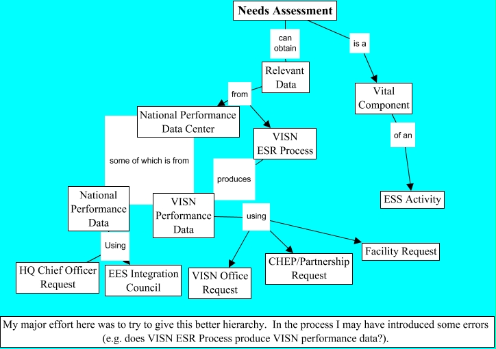 This Concept Map, created with IHMC CmapTools, has information related to: Needs Assessment-JN, Needs Assessment is a Vital Component, VISN ESR Process produces VISN Performance Data, Needs Assessment can obtain Relevant Data, National Performance Data Using EES Integration Council, Relevant Data from National Performance Data Center, VISN Performance Data using VISN Office Request, VISN Performance Data using Facility Request, VISN Performance Data using CHEP/Partnership Request, Relevant Data from VISN ESR Process, National Performance Data Center some of which is from VISN Performance Data, National Performance Data Center some of which is from National Performance Data, Vital Component of an ESS Activity, HQ Chief Officer Request Using EES Integration Council