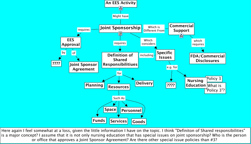 Joint Sponsorship-JN, Joint Sponsorship requires EES Approval, Joint Sponsorship requires Definition of Shared Responsibilitiues, Commercial Support Which is Different From Joint Sponsorship, Resources Such As Personnel, EES Approval by ????, Resources Such As Space, Definition of Shared Responsibilitiues for Resources, Specific Issues e.g. for ????, Specific Issues e.g. for Nursing Education, Definition of Shared Responsibilitiues including Specific Issues