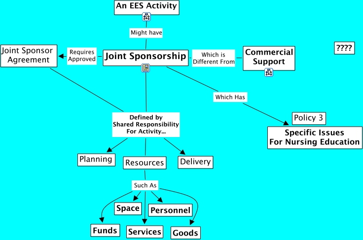 Joint Sponsorship, Resources Defined by Shared Responsibility For Activity... Joint Sponsorship, Resources Such As Space, Resources Such As Services, Commercial Support Which is Different From Joint Sponsorship, Joint Sponsor Agreement Defined by Shared Responsibility For Activity... Joint Sponsorship, Resources Such As Funds, Joint Sponsorship Requires Approved Joint Sponsor Agreement, Joint Sponsor Agreement Defined by Shared Responsibility For Activity... Delivery, Joint Sponsorship Which Has Specific Issues For Nursing Education, Resources Defined by Shared Responsibility For Activity... Planning