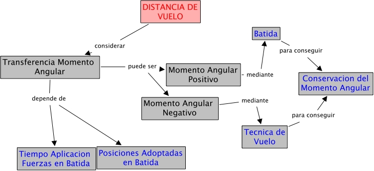Distancia_vuelo(2), Transferencia Momento Angular puede ser Momento Angular Negativo, DISTANCIA DE VUELO considerar Transferencia Momento Angular, Transferencia Momento Angular depende de Tiempo Aplicacion Fuerzas en Batida, Transferencia Momento Angular depende de Posiciones Adoptadas en Batida, Momento Angular Negativo mediante Tecnica de Vuelo, Transferencia Momento Angular puede ser Momento Angular Positivo, Batida para conseguir Conservacion del Momento Angular, Tecnica de Vuelo para conseguir Conservacion del Momento Angular, Momento Angular Positivo mediante Batida