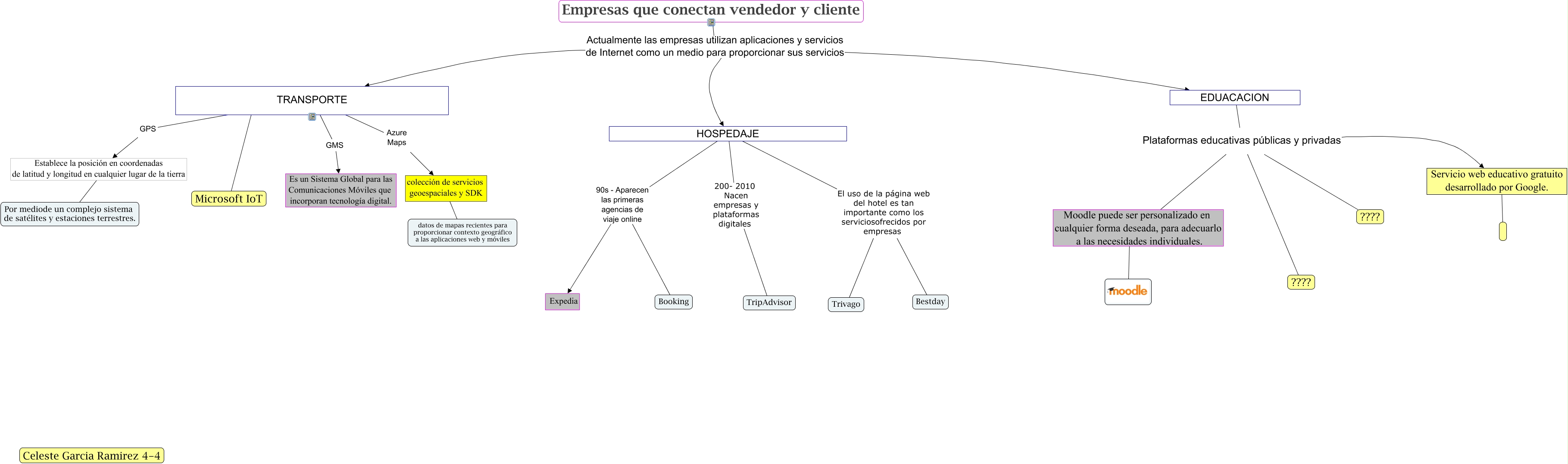 Este Cmap, tiene información relacionada con: _programa02_, EDUACACION Plataformas educativas públicas y privadas Servicio web educativo gratuito desarrollado por Google., Empresas que conectan vendedor y cliente Actualmente las empresas utilizan aplicaciones y servicios de Internet como un medio para proporcionar sus servicios HOSPEDAJE, EDUACACION Plataformas educativas públicas y privadas ????, Servicio web educativo gratuito desarrollado por Google. ????, Moodle puede ser personalizado en cualquier forma deseada, para adecuarlo a las necesidades individuales. ????, Empresas que conectan vendedor y cliente Actualmente las empresas utilizan aplicaciones y servicios de Internet como un medio para proporcionar sus servicios TRANSPORTE, HOSPEDAJE El uso de la página web del hotel es tan importante como los serviciosofrecidos por empresas Trivago, TRANSPORTE GPS Establece la posición en coordenadas de latitud y longitud en cualquier lugar de la tierra, Establece la posición en coordenadas de latitud y longitud en cualquier lugar de la tierra ???? Por mediode un complejo sistema de satélites y estaciones terrestres., HOSPEDAJE 90s - Aparecen las primeras agencias de viaje online Booking, TRANSPORTE ???? Microsoft IoT, Moodle puede ser personalizado en cualquier forma deseada, para adecuarlo a las necesidades individuales. Plataformas educativas públicas y privadas Servicio web educativo gratuito desarrollado por Google., EDUACACION Plataformas educativas públicas y privadas ????, Empresas que conectan vendedor y cliente Actualmente las empresas utilizan aplicaciones y servicios de Internet como un medio para proporcionar sus servicios EDUACACION, HOSPEDAJE 90s - Aparecen las primeras agencias de viaje online Expedia, Moodle puede ser personalizado en cualquier forma deseada, para adecuarlo a las necesidades individuales. Plataformas educativas públicas y privadas ????, HOSPEDAJE El uso de la página web del hotel es tan importante como los serviciosofrecidos por empresas Bestday, TRANSPORTE Azure Maps colección de servicios geoespaciales y SDK, HOSPEDAJE 200- 2010 Nacen empresas y plataformas digitales TripAdvisor, colección de servicios geoespaciales y SDK ???? datos de mapas recientes para proporcionar contexto geográfico a las aplicaciones web y móviles