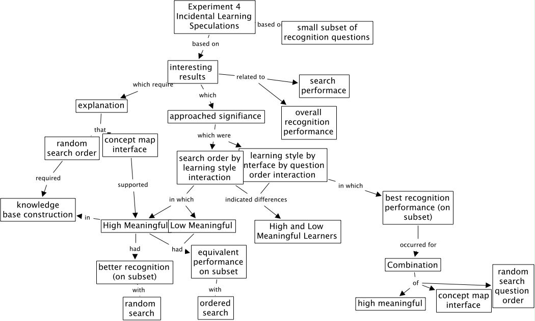 exp4 incidental, interesting results which approached signifiance, random search order required knowledge base construction, Combination of high meaningful, interesting results which require explanation, explanation that random search order, High Meaningful in knowledge base construction, Combination of random search question order, concept map interface supported High Meaningful, best recognition performance (on subset) occurred for Combination, search order by learning style interaction in which High Meaningful