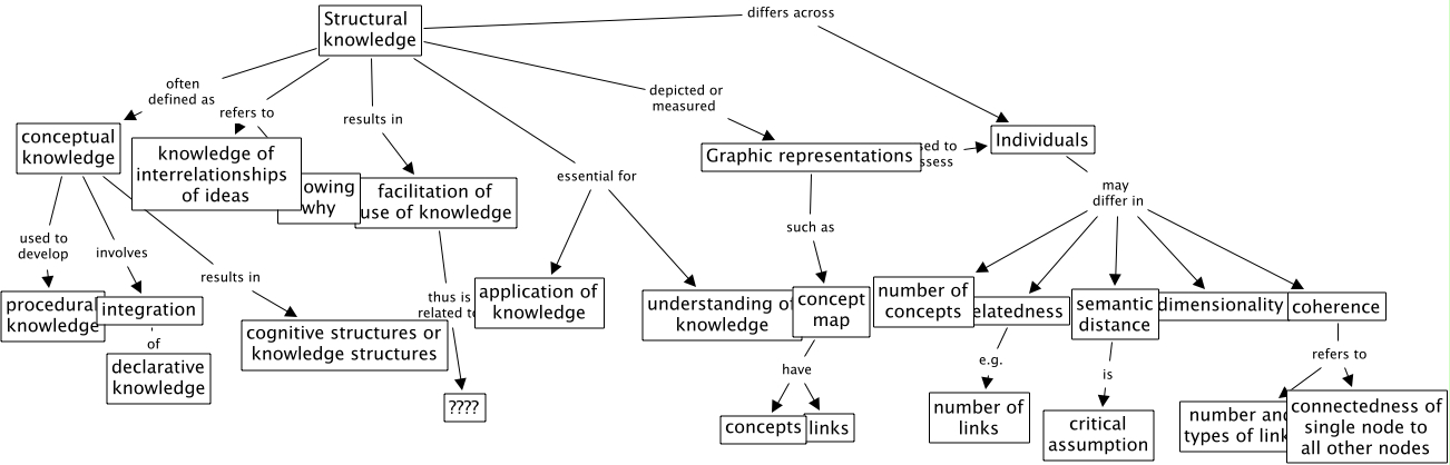 structural knowledge, Structural knowledge refers to knowing why, semantic distance is critical assumption, concept map have concepts, coherence refers to connectedness of single node to all other nodes, Structural knowledge essential for understanding of knowledge, integration of declarative knowledge, Individuals may differ in coherence, Structural knowledge essential for application of knowledge, facilitation of use of knowledge thus is related to ????, relatedness e.g. number of links