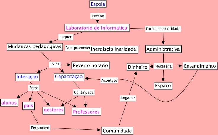 Escola, Comunidade Angariar Dinheiro, Interaçao Entre pais, Entendimento Acontece Capacitaçao, pais Pertencem Comunidade, Interaçao Entre gestores, Mudanças pedagogicas Exige Rever o horario, Interaçao Entre alunos, Administrativa Necessita Espaço, Laboratorio de Informatica Requer Mudanças pedagogicas, Capacitaçao Continuada Professores