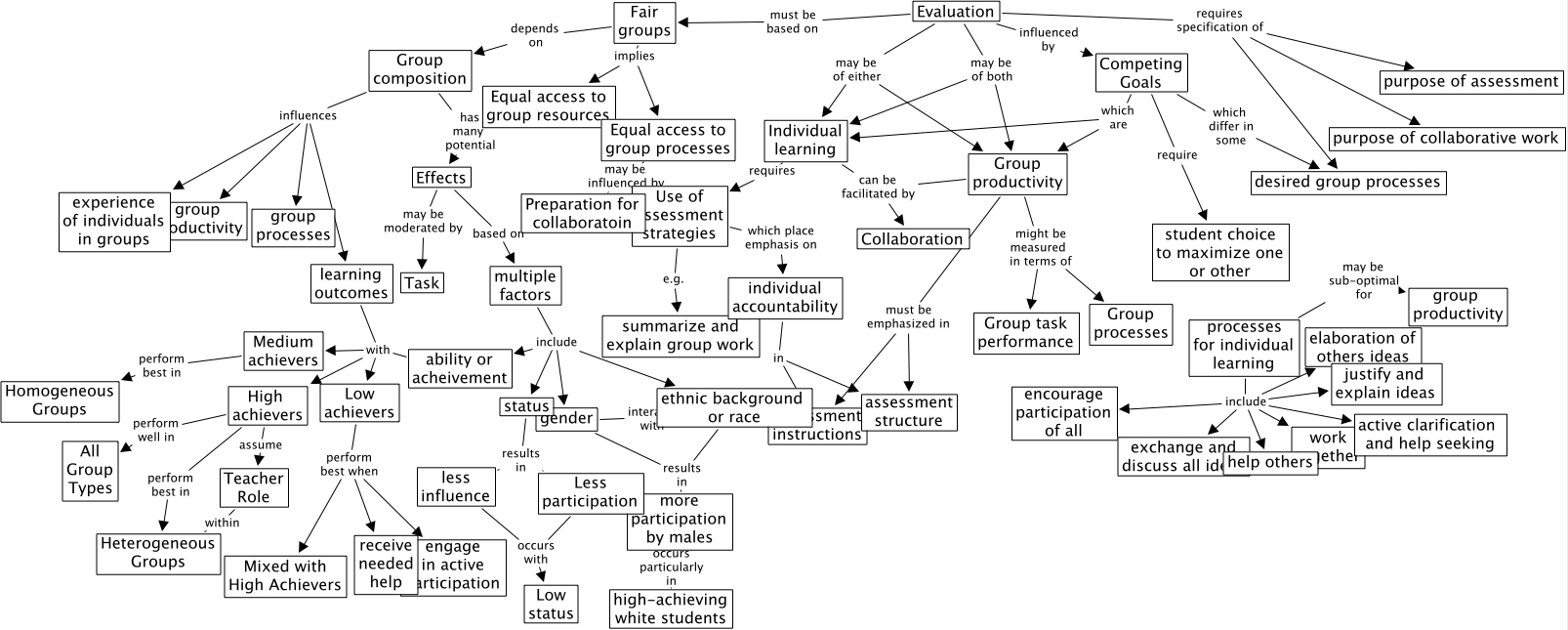 This Concept Map, created with IHMC CmapTools, has information related to: competing goals, Equal access to group processes may be influenced by Preparation for collaboratoin, multiple factors include ethnic background or race, learning outcomes with Medium achievers, Low achievers perform best when Mixed with High Achievers, Evaluation requires specification of desired group processes, ability or acheivement with Medium achievers, Low achievers perform best when engage in active participation, Group productivity can be facilitated by Collaboration, Use of assessment strategies which place emphasis on individual accountability, Group composition influences group processes, multiple factors include ability or acheivement, gender results in more participation by males, ability or acheivement with Low achievers, status results in Less participation, Less participation occurs with Low status, learning outcomes with Low achievers, High achievers assume Teacher Role, Effects may be moderated by Task, Evaluation must be based on Fair groups, Evaluation may be of both Individual learning