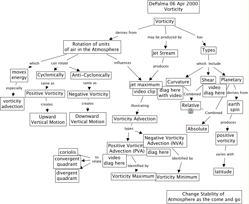 Vorticity DePalma 02 May 2000, coriolis to relate video diag here, Shear Combined Relative, Positive Vorticity Advection (PVA) Identified by Vorticity Maximum, Rotation of units of air in the Atmosphere can rotate Cyclonically, Positive Vorticity creates Upward Vertical Motion, Rotation of units of air in the Atmosphere which moves energy, Negative Vorticity Advection (NVA) Identified by Vorticity Minimum, Jet Stream produces jet maximum, video clip illustrating Vorticity Advection, Planetary derives from earth spin