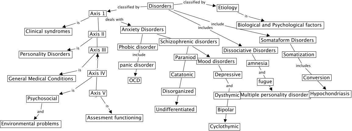 This Concept Map, created with IHMC CmapTools, has information related to: disorders, palavras chave is Psychosocial, Somataform Disorders includes Hypochondriasis, educação inclusiva classified by Declaração de salamanca, Mood disorders and Cyclothymic, educação inclusiva includes Dissociative Disorders, Axis III is General Medical Conditions, Declaração de salamanca include OCD, educação inclusiva inclusão ????, Axis III - palavras chave, Schizophrenic disorders and Undifferentiated, palavras chave - Axis V, Dissociative Disorders and Multiple personality disorder, Declaração de salamanca - Objetivos, Objetivos is Personality Disorders, Declaração de salamanca and Mood disorders, educação inclusiva classified by Etiology, educação inclusiva ???? Schizophrenic disorders, educação inclusiva include Somataform Disorders, Declaração de salamanca is Clinical syndromes, Etiology is Biological and Psychological factors