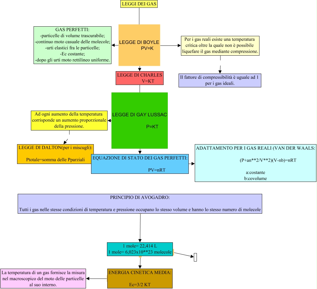 Questa Cmap, creata con IHMC CmapTools, contiene informazioni relative a: GAS2, LEGGI DEI GAS LEGGE DI BOYLE PV=K Per i gas reali esiste una temperatura critica oltre la quale non è possibile liquefare il gas mediante compressione., PRINCIPIO DI AVOGADRO: Tutti i gas nelle stesse condizioni di temperatura e pressione occupano lo stesso volume e hanno lo stesso numero di molecole 1 mole= 22,414 L 1 mole= 6,023x10**23 molecole, LEGGE DI CHARLES V=KT LEGGE DI GAY LUSSAC P=KT Ad ogni aumento della temperatura corrisponde un aumento proporzionale della pressione., 1 mole= 22,414 L 1 mole= 6,023x10**23 molecole ENERGIA CINETICA MEDIA: Ec=3/2 KT, LEGGE DI CHARLES V=KT LEGGE DI GAY LUSSAC P=KT EQUAZIONE DI STATO DEI GAS PERFETTI: PV=nRT, ENERGIA CINETICA MEDIA: Ec=3/2 KT La temperatura di un gas fornisce la misura nel macroscopico del moto delle particelle al suo interno., Per i gas reali esiste una temperatura critica oltre la quale non è possibile liquefare il gas mediante compressione. Il fattore di compressibilità è uguale ad 1 per i gas ideali., EQUAZIONE DI STATO DEI GAS PERFETTI: PV=nRT ADATTAMENTO PER I GAS REALI (VAN DER WAALS: (P+an**2/V**2)(V-nb)=nRT a:costante b:covolume, LEGGI DEI GAS LEGGE DI BOYLE PV=K GAS PERFETTI: -particelle di volume trascurabile; -continuo moto casuale delle molecole; -urti elastici fra le particelle; -Ec costante; -dopo gli urti moto rettilineo uniforme., Ad ogni aumento della temperatura corrisponde un aumento proporzionale della pressione. LEGGE DI DALTON(per i miscugli): Ptotale=somma delle Pparziali, LEGGI DEI GAS LEGGE DI BOYLE PV=K LEGGE DI CHARLES V=KT, 1 mole= 22,414 L 1 mole= 6,023x10**23 molecole