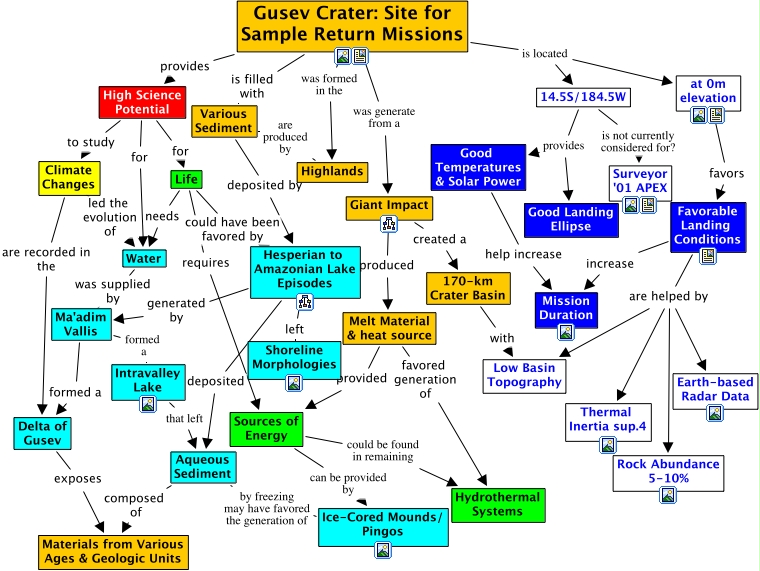 This Concept Map, created with IHMC CmapTools, has information related to: Gusev, Favorable Landing Conditions increase Mission Duration, 14.5S/184.5W is not currently considered for? Surveyor '01 APEX, Various Sediment deposited by Hesperian to Amazonian Lake Episodes, Good Temperatures & Solar Power help increase Mission Duration, Ma'adim Vallis formed a Delta of Gusev, Giant Impact created a 170-km Crater Basin, Gusev Crater: Site for Sample Return Missions was formed in the Highlands, High Science Potential to study Climate Changes, Delta of Gusev exposes Materials from Various Ages & Geologic Units, Hesperian to Amazonian Lake Episodes deposited Aqueous Sediment, Intravalley Lake that left Aqueous Sediment, Gusev Crater: Site for Sample Return Missions was generate from a Giant Impact, High Science Potential for Water, Aqueous Sediment composed of Materials from Various Ages & Geologic Units, 14.5S/184.5W provides Good Temperatures & Solar Power, Hesperian to Amazonian Lake Episodes generated by Ma'adim Vallis, 14.5S/184.5W provides Good Landing Ellipse, Favorable Landing Conditions are helped by Rock Abundance 5-10%, Favorable Landing Conditions are helped by Earth-based Radar Data, Favorable Landing Conditions are helped by Low Basin Topography