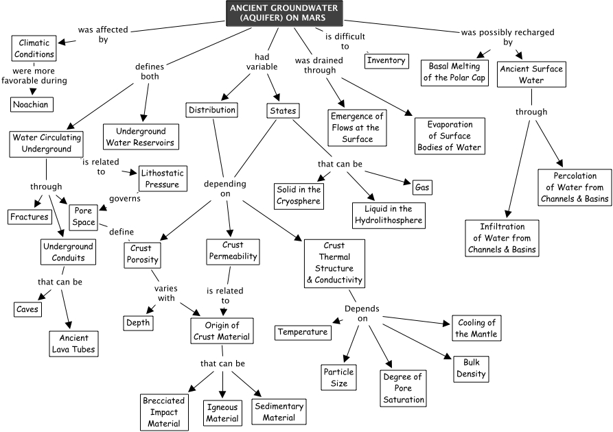 Ancient Groundwater, States depending on Crust Porosity, Distribution depending on Crust Permeability, Origin of Crust Material that can be Igneous Material, Distribution depending on Crust Thermal Structure & Conductivity, ANCIENT GROUNDWATER (AQUIFER) ON MARS was possibly recharged by Ancient Surface Water, Water Circulating Underground is related to Lithostatic Pressure, States that can be Liquid in the Hydrolithosphere, Water Circulating Underground through Fractures, Crust Thermal Structure & Conductivity Depends on Temperature, Water Circulating Underground through Underground Conduits