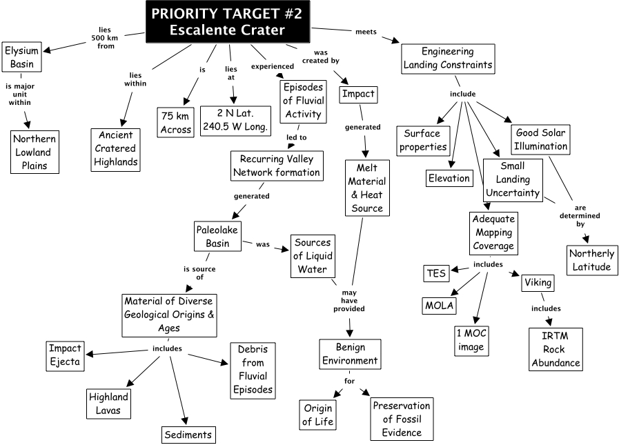 Escalente VGB2, Impact generated Melt Material & Heat Source, Engineering Landing Constraints include Elevation, PRIORITY TARGET #2 Escalente Crater is 75 km Across, Material of Diverse Geological Origins & Ages includes Highland Lavas, Material of Diverse Geological Origins & Ages includes Impact Ejecta, Melt Material & Heat Source may have provided Benign Environment, Paleolake Basin was Sources of Liquid Water, Elysium Basin is major unit within Northern Lowland Plains, PRIORITY TARGET #2 Escalente Crater meets Engineering Landing Constraints, Good Solar Illumination are determined by Northerly Latitude