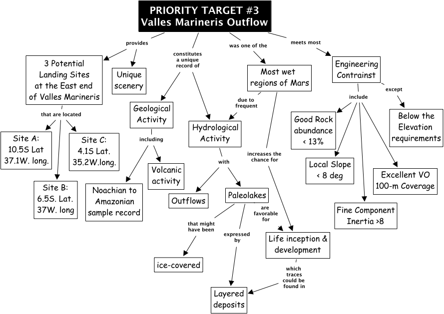 Valles Marineris Outflow, Geological Activity including Noachian to Amazonian sample record, Paleolakes expressed by Layered deposits, Most wet regions of Mars increases the chance for Life inception & development, Engineering Contrainst include Fine Component Inertia ɴ, 3 Potential Landing Sites at the East end of Valles Marineris that are located Site C: 4.1S Lat. 35.2W.long., PRIORITY TARGET #3 Valles Marineris Outflow constitutes a unique record of Geological Activity, Engineering Contrainst include Excellent VO 100-m Coverage, Paleolakes are favorable for Life inception & development, Life inception & development which traces could be found in Layered deposits, PRIORITY TARGET #3 Valles Marineris Outflow was one of the Most wet regions of Mars