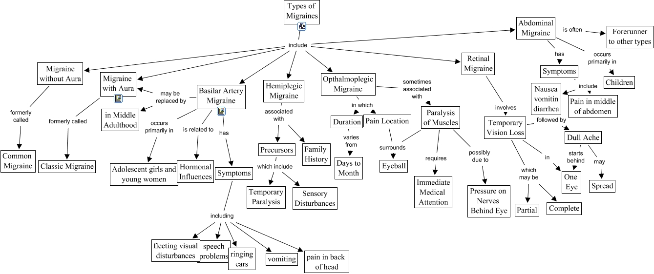 This Concept Map, created with IHMC CmapTools, has information related to: migraine types, Temporary Vision Loss which may be Partial, Precursors which include Temporary Paralysis, Basilar Artery Migraine occurs primarily in Adolescent girls and young women, Hemiplegic Migraine associated with Precursors, Types of Migraines include Migraine with Aura, Types of Migraines include Basilar Artery Migraine, Migraine without Aura formerly called Common Migraine, Types of Migraines include Hemiplegic Migraine, Symptoms including fleeting visual disturbances, Basilar Artery Migraine may be replaced by Migraine with Aura, Types of Migraines include Migraine without Aura, Basilar Artery Migraine may be replaced by in Middle Adulthood, Abdominal Migraine has Symptoms, Opthalmoplegic Migraine in which Duration, Temporary Vision Loss followed by Dull Ache, Types of Migraines include Opthalmoplegic Migraine, Pain Location surrounds Eyeball, Symptoms include Pain in middle of abdomen, Retinal Migraine involves Temporary Vision Loss, Symptoms including ringing ears